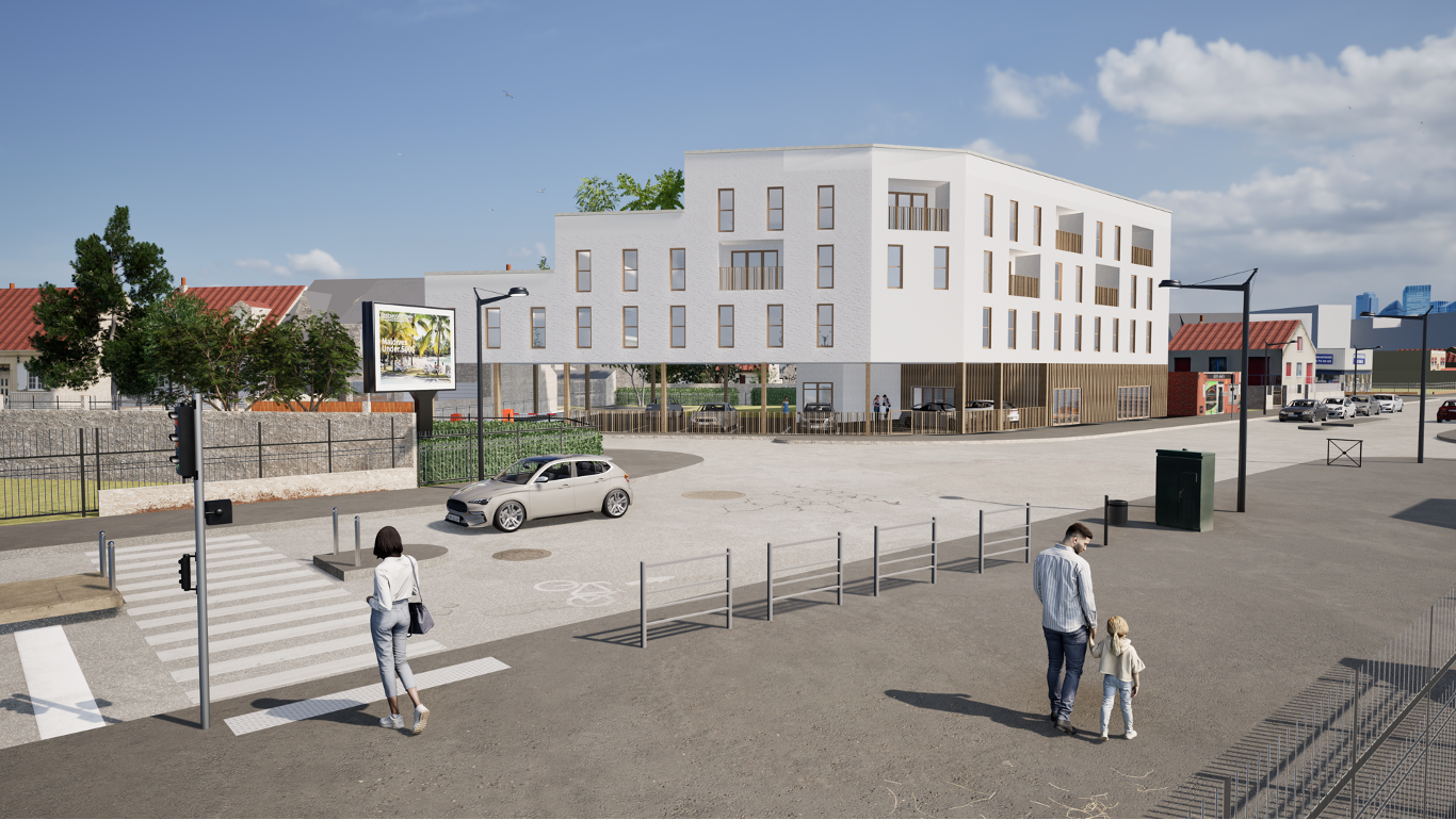 Bâtiment collectif de R-1 à R+5, à usage mixte d’habitation avec 34 logements & usage professionnel avec un linéaire actif de 2 cellules commerciales en rez-de-chaussée.